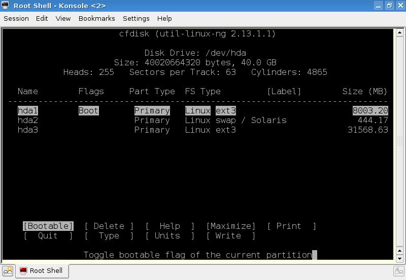 # cfdisk /dev/hda