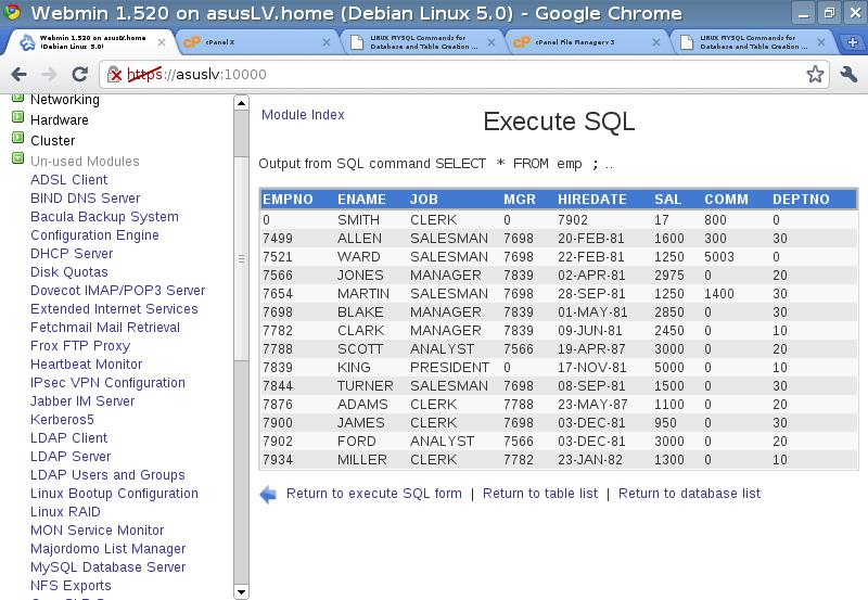 Now we can connect to the DB server over the LAN using one of many SQL Front End Apps from a Windows machine, or use Webmin which includes a MYSQL frontend by default - GREAT!: