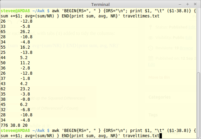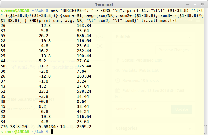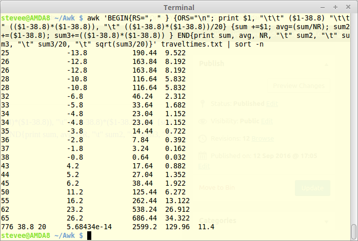 awk 'BEGIN{RS=", " } {ORS="\n"; print $1, "\t\t" ($1-38.8) "\t\t" (($1-38.8)*($1-38.8)), "\t" (($1-38.8)*($1-38.8))/20} {sum +=$1; avg=(sum/NR); sum2+=($1-38.8); sum3+=(($1-38.8)*($1-38.8)) } END{print sum, avg, NR, "\t" sum2, "\t" sum3, "\t" sum3/20, "\t" sqrt(sum3/20)}' traveltimes.txt | sort -n