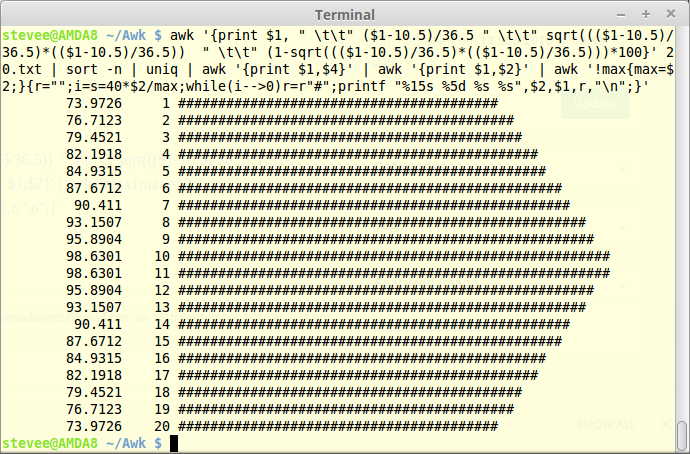 awk '{print $1, " \t\t" ($1-10.5)/36.5 " \t\t" sqrt((($1-10.5)/36.5)*(($1-10.5)/36.5)) " \t\t" (1-sqrt((($1-10.5)/36.5)*(($1-10.5)/36.5)))*100}' 20.txt | sort -n | uniq | awk '{print $1,$4}' | awk '{print $1,$2}' | awk '!max{max=$2;}{r="";i=s=40*$2/max;while(i-->0)r=r"#";printf "%15s %5d %s %s",$2,$1,r,"\n";}'