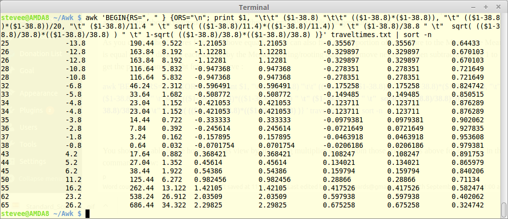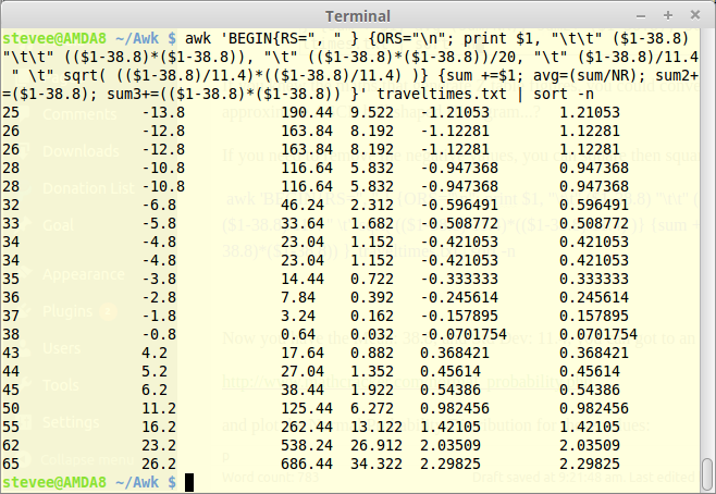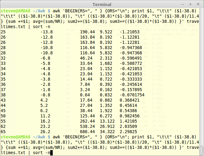 awk 'BEGIN{RS=", " } {ORS="\n"; print $1, "\t\t" ($1-38.8) "\t\t" (($1-38.8)*($1-38.8)), "\t" (($1-38.8)*($1-38.8))/20, "\t" ($1-38.8)/11.4} {sum +=$1; avg=(sum/NR); sum2+=($1-38.8); sum3+=(($1-38.8)*($1-38.8)) }' traveltimes.txt | sort -n