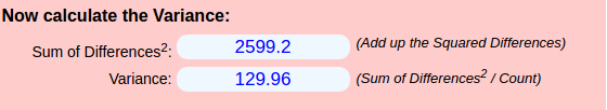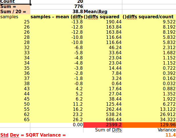 The Variance can be calculated from the differences squared sum (2599.2) by dividing it by the number of samples (20), which needs to be evaluated again as NR for use as the divisor (20) in the END section:
