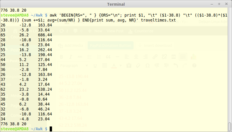 awk 'BEGIN{RS=", " } {ORS="\n"; print $1, "\t\t" ($1-38.8) "\t\t" (($1-38.8)*($1-38.8))} {sum +=$1; avg=(sum/NR); sum2+=($1-38.8); sum3+=(($1-38.8)*($1-38.8)) } END{print sum, avg, NR, "\t" sum2, "\t" sum3, sum3/20, sqrt(sum3/20)}' traveltimes.txt