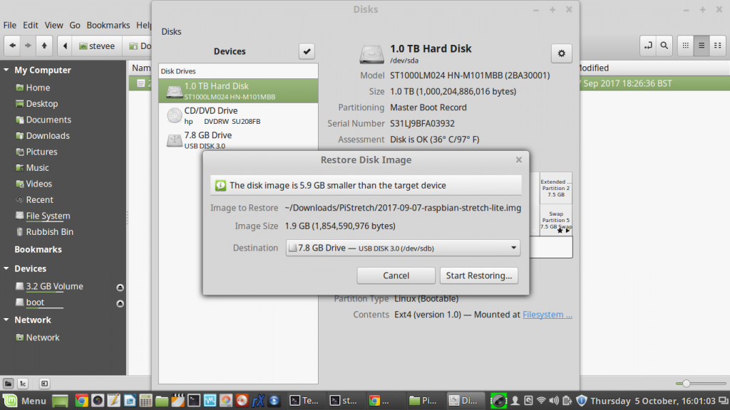 Right click the Raspbian image for the Disk Image Writer in Mint and write to your USB device: