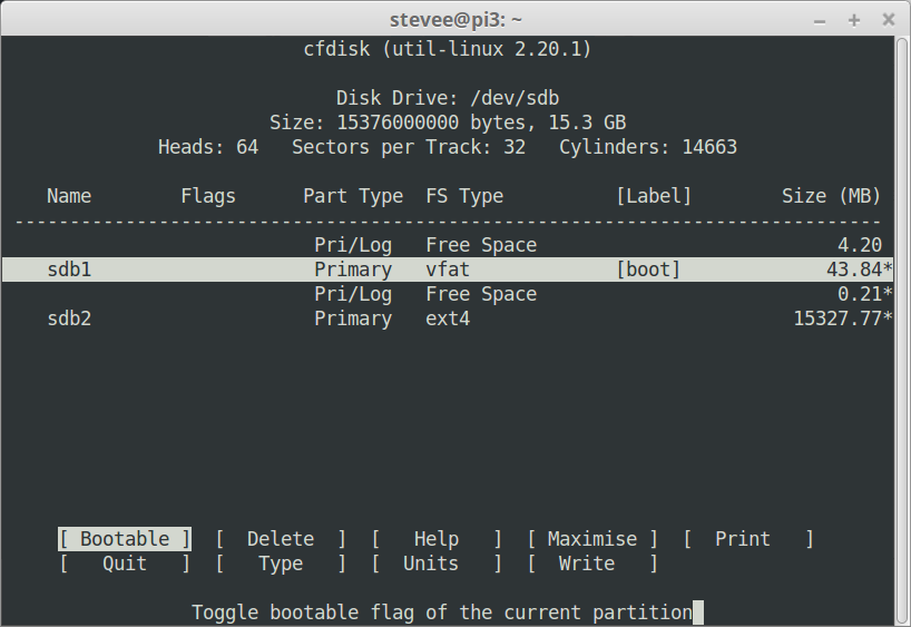 stevee@pi3:~ $ sudo cfdisk /dev/sda
