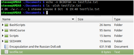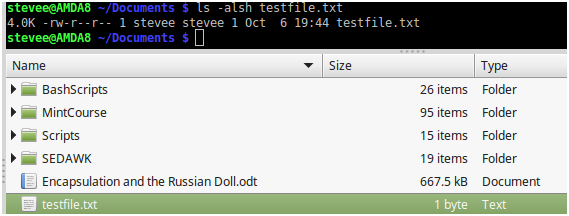 4.0K -rw-r--r-- 1 stevee stevee 1 Oct 3 16:43 testfile.txt