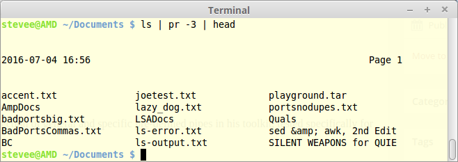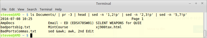 ls Documents/ | pr -3 | head | sed -n '1,2!p' | sed -n '2,3!p' | sed -n '5,7!p'