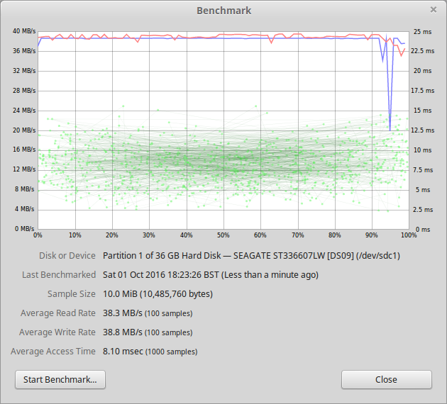 I want to know how SCSI disks compare with this test also, as SCSI historically was probably the main disk types used on most linux servers in the past due to their speed, build quality, lifespan and robustness. I dug out some old Ultra320 36GB disks I have with a PCI SCSI card and discovered another function in Disks. As SCSI does not have SMART functions, Disks can use the graphical display for benchmarking SCSI disks: