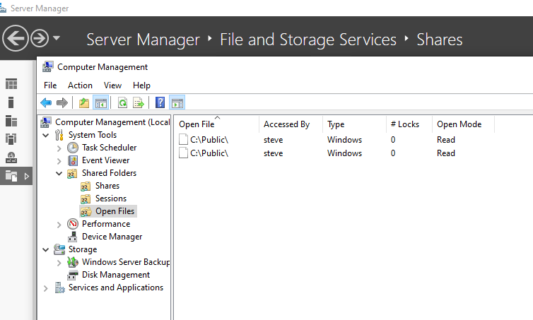 1. Identify Open Files: Using Server Manager > Files and Storage Services to see which user has a specific file locked.