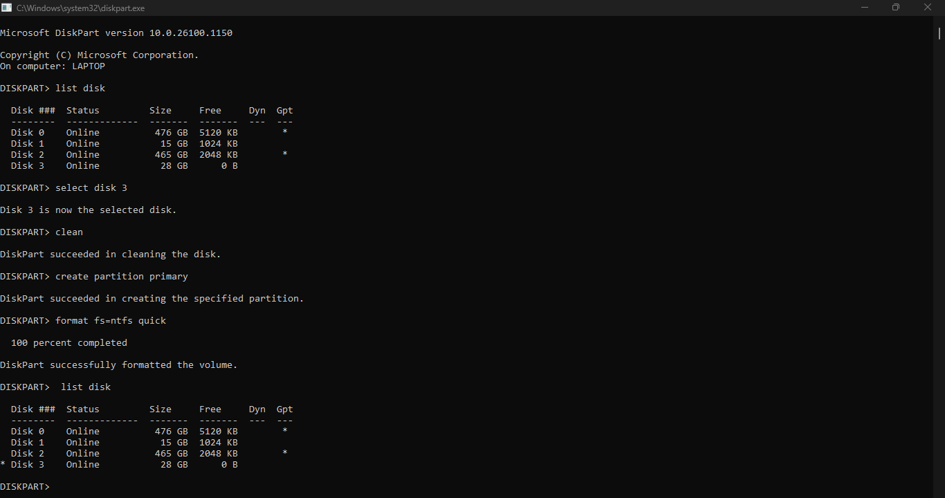 3. Type list disk (Identify your USB stick—usually Disk 1 or 2).