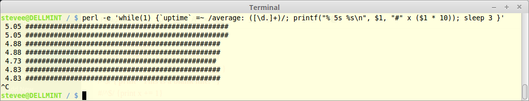 perl -e 'while(1) {`uptime` =~ /average: ([\d.]+)/; printf("% 5s %s\n", $1, "#" x ($1 * 10)); sleep 3 }'
