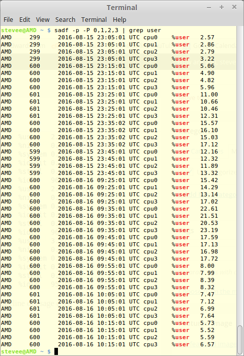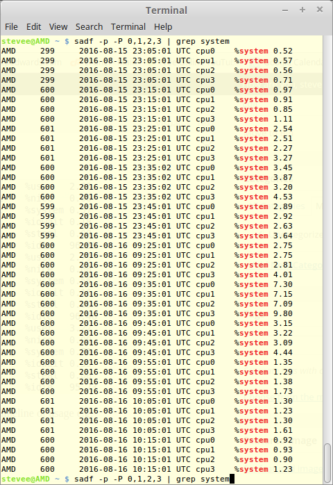 sadf -p -P 0,1,2,3 | grep user | grep cpu0 | awk '{print $3,$4,$7}' > data1.dat