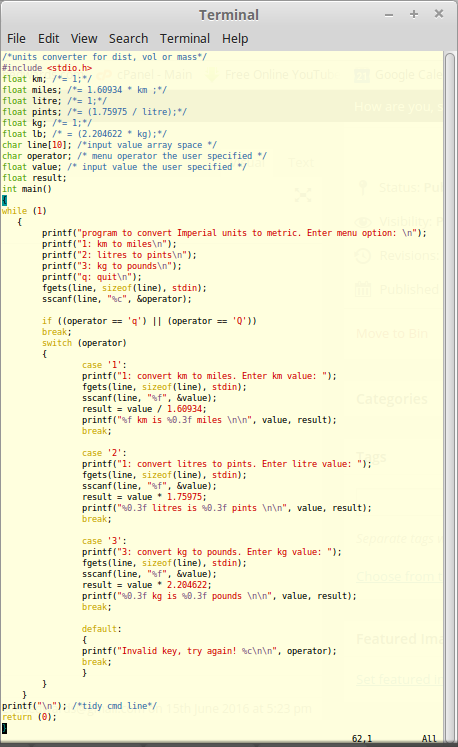 printf("program to convert Imperial units to metric. Enter menu option: \n");
