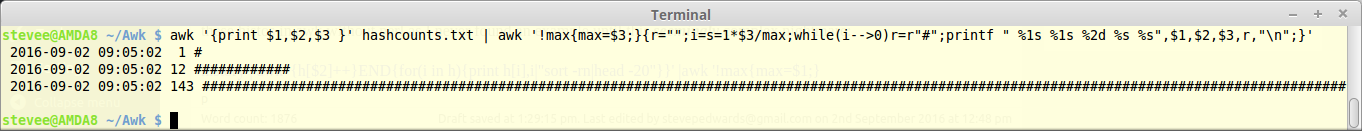 awk '{print $1,$2,$3}' dstat15secs.txt | awk '!max{max=$3;}{r="";i=s=60*$3/max;while(i-->0)r=r"#";printf " %1s %1s %2d %s %s",$1,$2,$3,r,"\n";}'