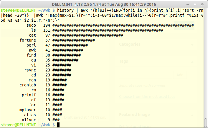 The first above is easy-ish - loops to find how many occurrences of each command used, sorts high to low numerically, then heads it to only 20. (The full history record varies on setup and linux dist. Mint default list is: