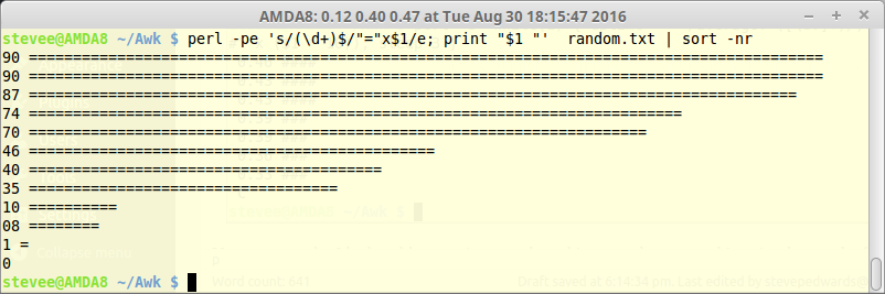 perl -pe 's/(\d+)$/"="x$1/e; print "$1 "' random.txt | sort -nr
