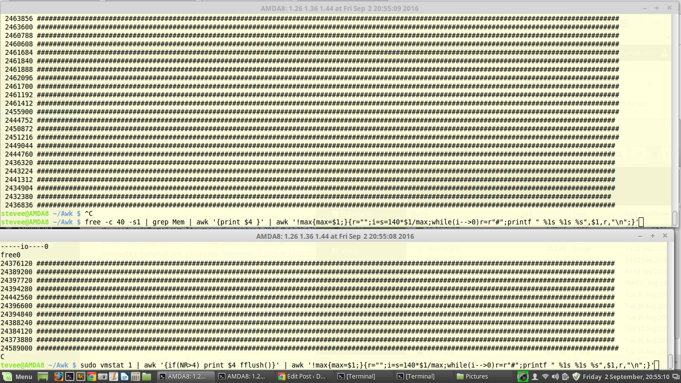 free -c 40 -s1 | grep Mem | awk '{print $4 }' | awk '!max{max=$1;}{r="";i=s=140*$1/max;while(i-->0)r=r"#";printf " %1s %1s %s",$1,r,"\n";}'