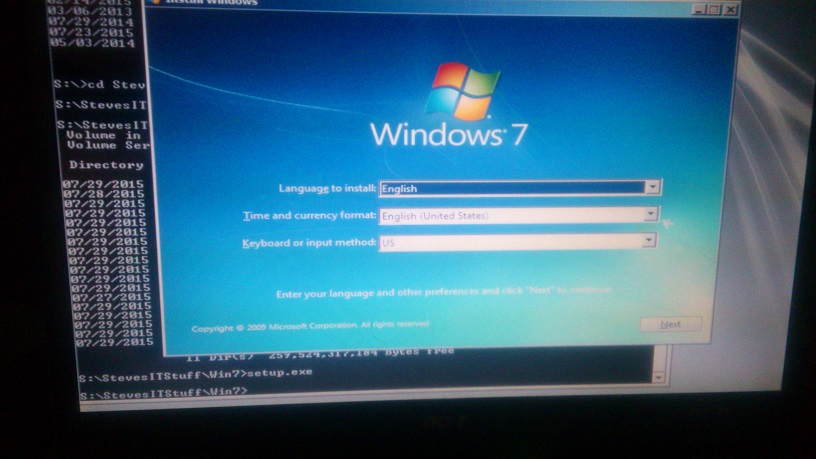 Now CD to the mapped drive S: that contains your Win7 setup files, and run setup.exe