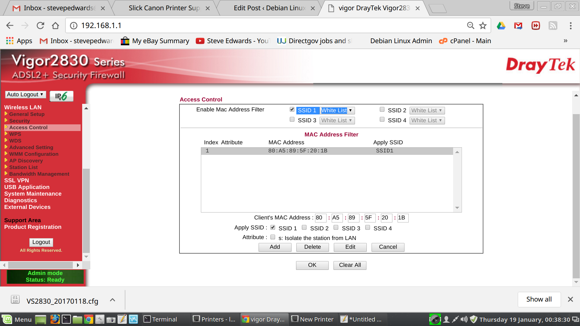 My Draytek offers multi wifi SSIDs so the MAC address of the printer had to be set against one FIRST before the printer was allowed to wifi connect and get an IP address permanently..what a farce...