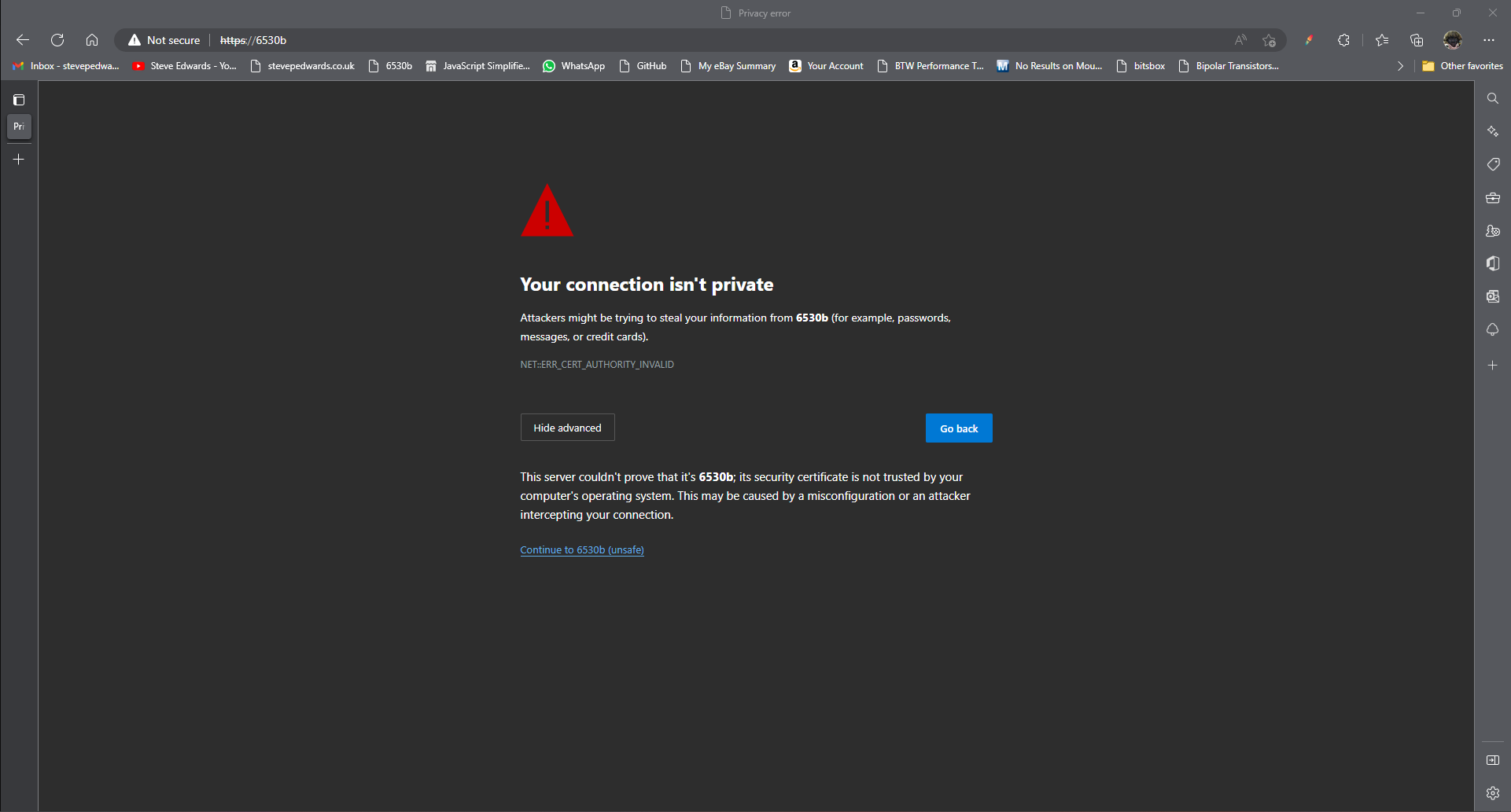 Continue on and you will get to your site but with the HTTPS struck through - but as seen in wireshark - the traffic IS still encrypted on port 443 using TLS: