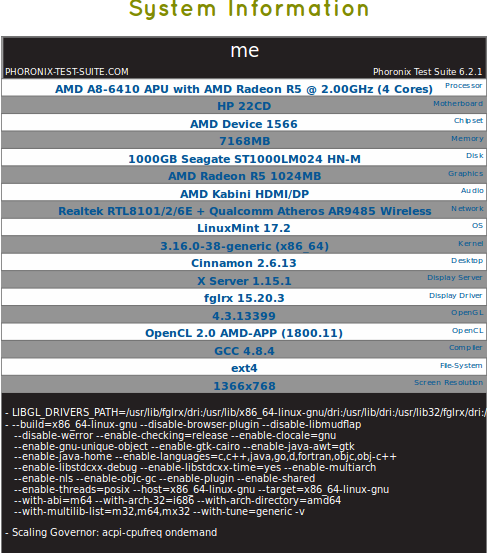 Processor: AMD A8-6410 APU with AMD Radeon R5 @ 2.00GHz (4 Cores), Motherboard: HP 22CD, Chipset: AMD Device 1566, Memory: 7168MB, Disk: 1000GB Seagate ST1000LM024 HN-M, Graphics: AMD Radeon R5 1024MB, Audio: AMD Kabini HDMI/DP, Network: Realtek RTL8101/2/6E + Qualcomm Atheros AR9485 Wireless