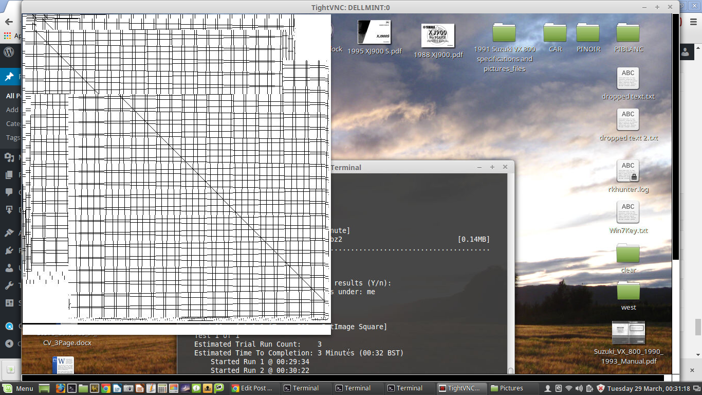 I installed phoronix on a PC to test some graphics cards I have to sell, and on my localhost core laptop to compare and run diff tests simultaneously, as below. Choose your tests carefully as there are massive associated downloads! It takes a while to get something going with any results....the simplest graphics test (I assume) for H264 vid files is 9 mins long then failed as it didn't complete, so create the null results file: