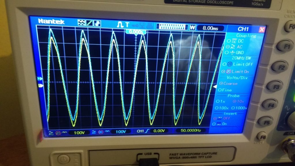 The primary above shows 700Vpp (UK mains 240V RMS = 480V RMS pp = 480 x 1.414 = 679Vpp but showing more than 700Vpp here!) on x10 probes and 100V/div: