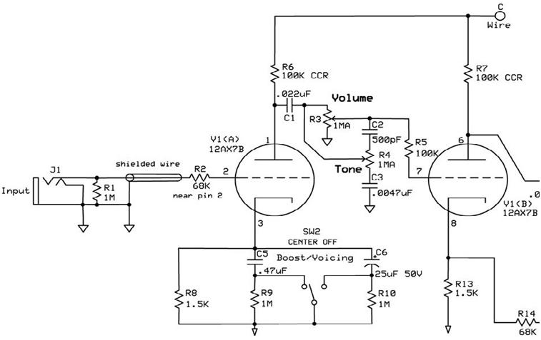 This cannot be altered with the volume or tone controls as they don't connect to this triode, as DC is blocked by C1.