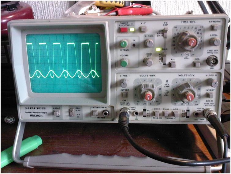 Probe x 1, 2V/div - input 1V, at 1 kHz, voltage Gain = 2V: