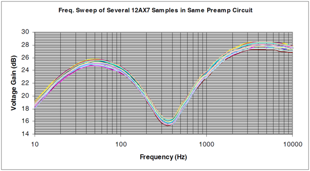 I took readings of the voltage levels at set frequencies using the FLS Tone Gen circuit with the intent to generate a Frequency Response curve - a purely academic exercise and not definitive for the 12AX7 in any way. It is just to get an idea of the workings of a valve, and give an idea what is involved in plotting a Frequency Response curve should you wish to try it, and it will give you a better understanding of why your amps sound the way they do - their tonal response.