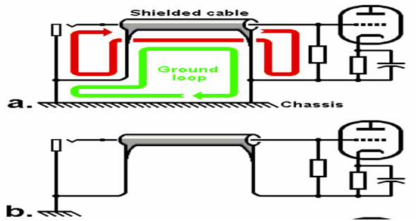The guitar signal passes through a 68k resistor to the gate/grid (pin 2) of the first triode for initial amplification. The screened lead is prepped for the braid being grounded at one end only, to prevent an ground loop in A below - from the Grounding PDF (have you read it yet?!):