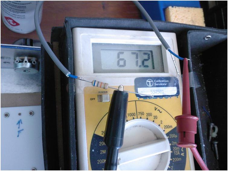 Above - After soldering the lead to the 68k resistor and removing the braid at that end, I check for a good joint with the DDM. The input signal is the most important to keep clean of noise, at the start of the amplification chain.