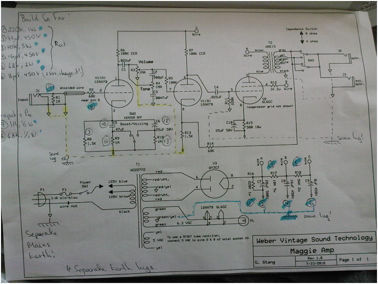 In a test build like this, it will be messy as there is no board layout to follow exactly, and I found a couple of mistakes in the Handbook wiring diagram anyway - most importantly, a ground at pin 2 of the 12AX7 - it should not be there, as this is the guitar signal pin. It was easier to just follow the Maggie schematic in general, but with some component value changes, to use what I have that were bought from the Handbook parts list. I don't anticipate this causing major issues as these two circuits are so similar.