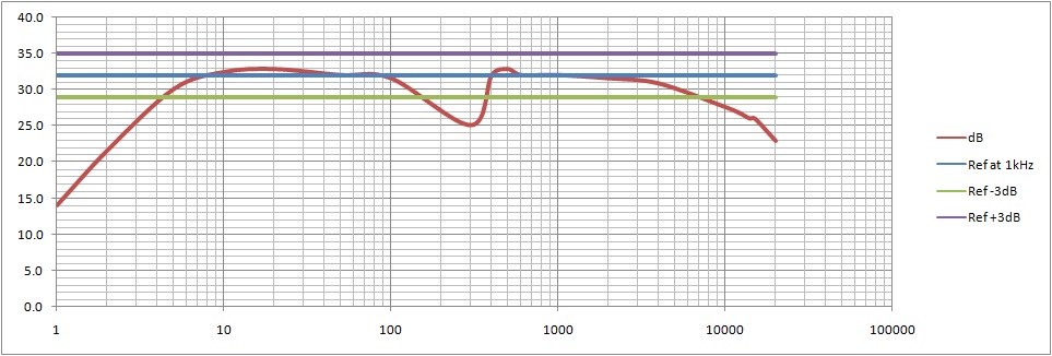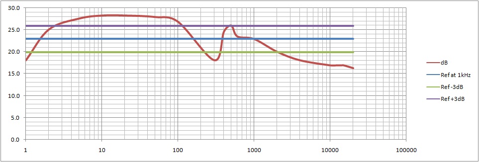 This gives a very rough Bandwidth result from the graph, if the reference level is taken at 1kHz. It is about 1-11kHz +/- 5dB, to include the strange trough and peak in the 500Hz region! It was really odd here - with big differences in amplification from 100-500Hz.