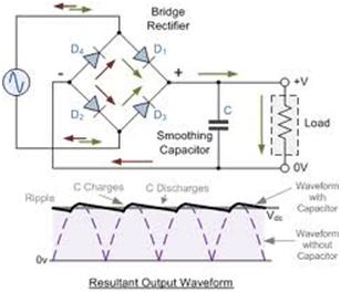 Once you have drawn this out yourself a few times you should remember it. You can see the effect of the smoothing capacitor as it discharges during the AC drop in voltage, keeping the DC level more constant across the load. As a general rule, the bigger capacitance the smoothing or "reservoir" capacitor has, the better the smoothing. You may see values as little as 8uF going up to 32uF, 47uF or 100uF, with 350V-600V working limits.