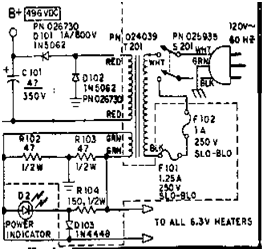 Now can see how the 335V DC comes from the secondary step up windings of this particular transformer, to charge capacitor C14. You may see variations of 20-30V difference from amp to amp (hence the 10% testing allowance) depending on the transformer, and circuit resistances etc.