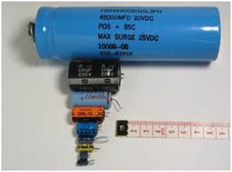 I have already mentioned these above, but a look at the circuits will show some common values of electrolytic types used for the AC rectification stage. These are the ones that need to be drained before working on a circuit to avoid lethal shocks. The values on the side state the charge capacity, e.g. 100uF at 450V DC working voltage. This means they should withstand that maximum voltage across them without failure, with the polarity the right way ONLY! They can explode if the polarity is reversed or they get shorted out when charged up. There is usually a stripe of arrows down the side pointing to the negative terminal.