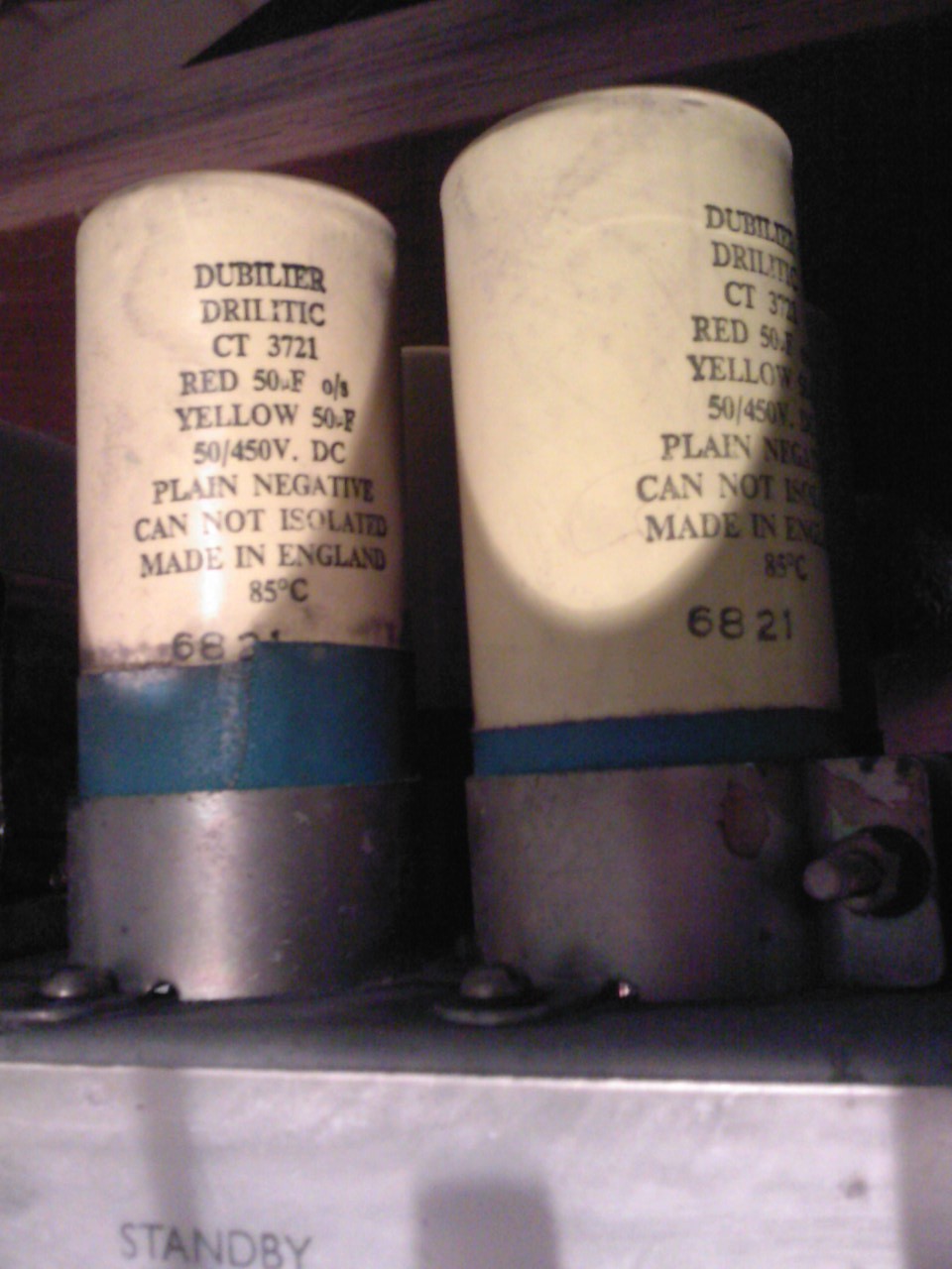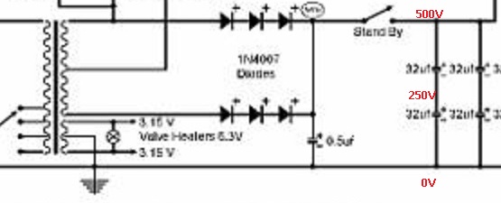 This would be quite a low value for first stage smoothing for an amp of this current draw potential, so NOW, another two in series are often seen added in parallel to the first pair, so their combined values in parallel ADD, to give 2 x 16uF in parallel to get back to effectively 1 large rated cap of 32uF in value, that can stand a high voltage of 500V DC.