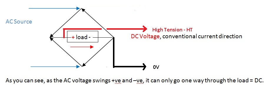 As you can see, as the AC voltage swings +ve and -ve, it can only go one way through the load = DC.