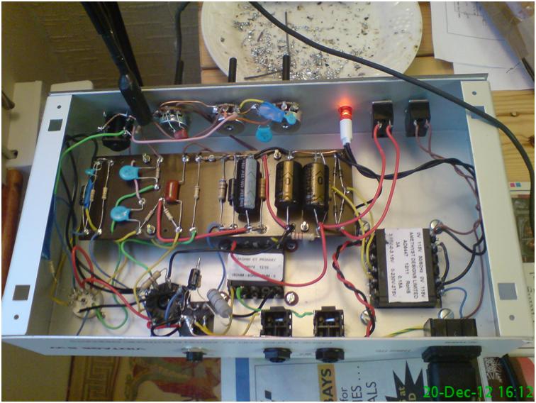 Once you have placed all components on the eyelet board, double checked all component values and placement, soldered them together, and made a tidier job of your wiring than me (below), tested for continuity as per the instructions test procedure, you will be ready to do the first power up test, with no valves inserted: