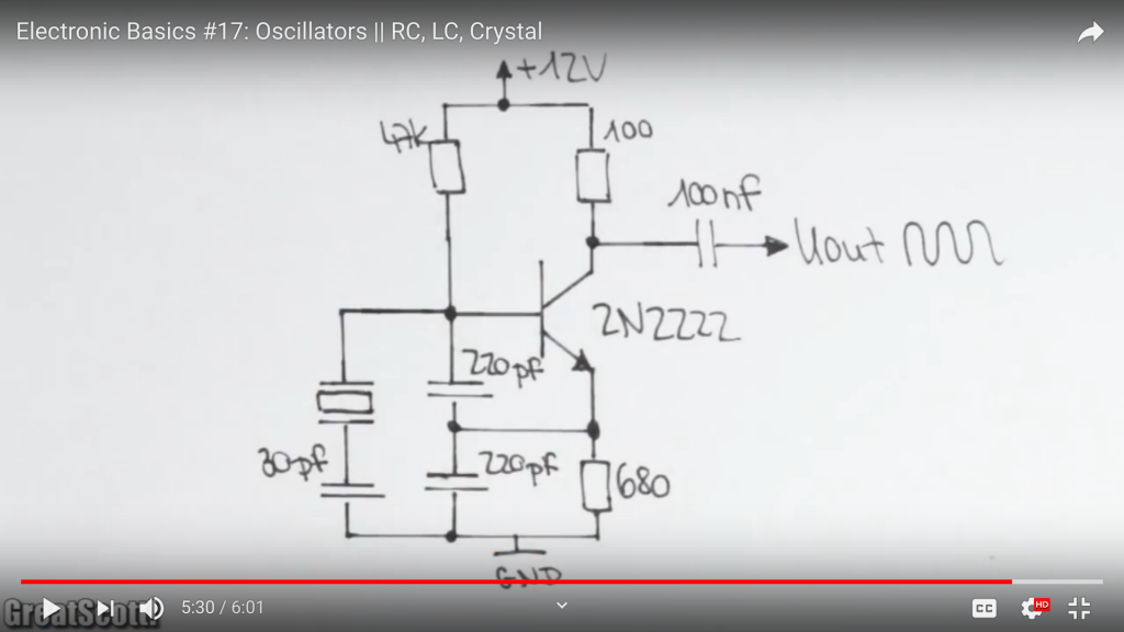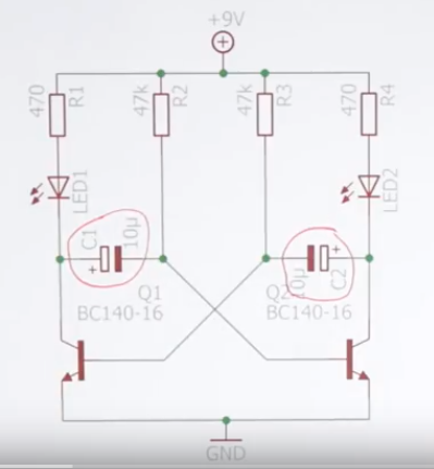 Above is Scott's Crystal Oscillator circuit I failed with due to not having correct value parts (and it seems crystals are a pig to get oscillating on a breadboard anyway!), so moved on to his astable multivibrator circuit instead. I had some hassle getting this thing going too due to bad bread board connections (used 2N2222 transistors), as with no caps, the LEDs light anyway but stay on!