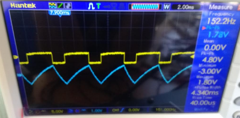 I changed Scott's 10uF to 100uF caps to slow it down,-  to be sure I could see change. Later, when working, the 10uF caps gave-  a 16.8Hz ramp --  an annoying flicker rate! 100uFs gave a 1.39Hz ramp.