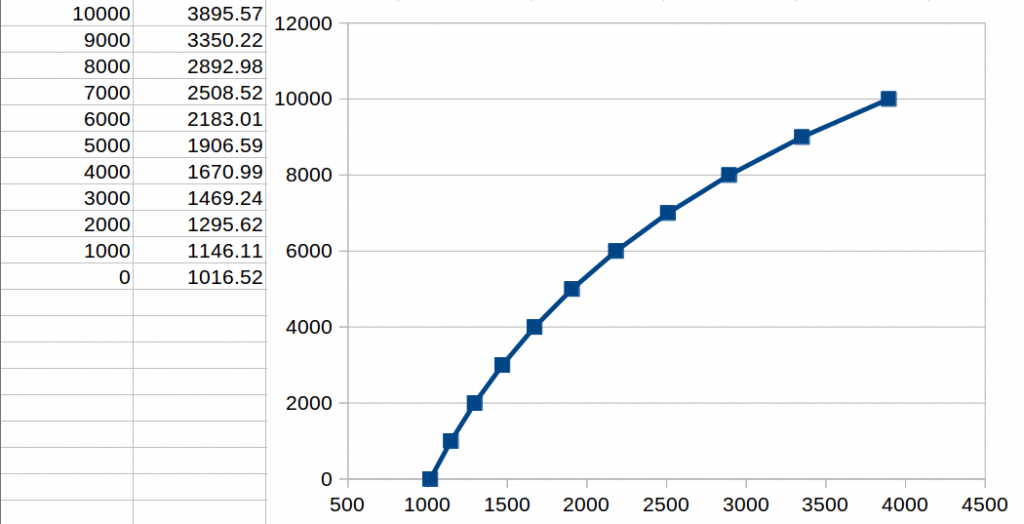 So it's clear what the complex log calc in the bmp180 datasheet, so the library, has to cater for, if you input alt in meters to your bmp180 and read it's relative sea level pressure, then plot in Excel/Calc etc.:
