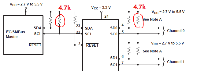 (The resistor value technically depends on many factors like bus speed and capacitance, but in reality for a few devices on short wires, 4.7k resistors works fine). See Texas Inst. PDF link: https://www.ti.com/lit/an/slva689/slva689.pdf )