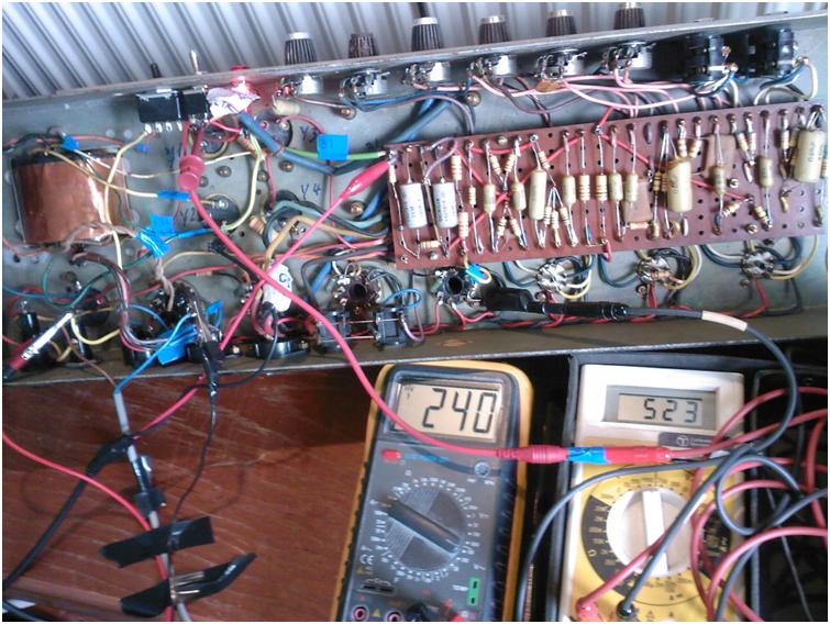 and I will pass offers on to John (sensible offers ONLY please from collectors or gigging musicians who know what this is, and that it will need some TLC to become a workhorse again. Possibly new pots, bias slider, re-biasing, re-sleeving of transformer wire insulation and all electrolytics changed out and/or reformed, though re-forming looks like a bad idea as they will fail sooner or later and may cause serious damage to the mains transformer if they fail short: