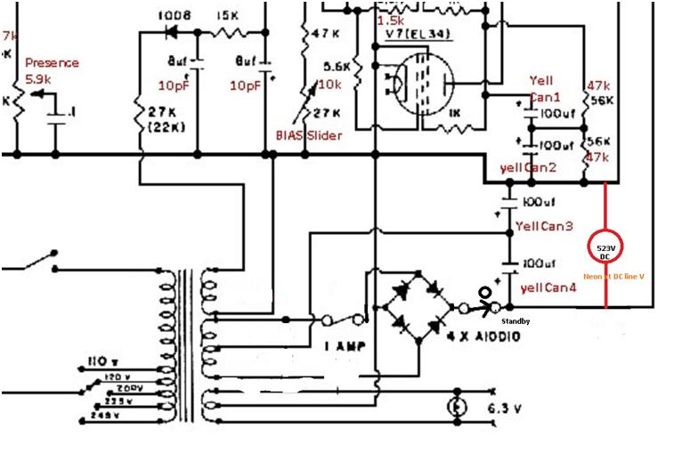 I moved the Standby switch to after the diodes as with the other amps so the caps don't charge until this is on. The original Marshall 6.3V bulb was blown, so I used a 240V neon across the mains primary switch to Ground. There is no hole for a Standby light - which personally, I think all amps should have. Just for interest's sake, I took the Variac opportunity to push these 220V AC neons to their limit - they do stand 525V DC or more across them!
