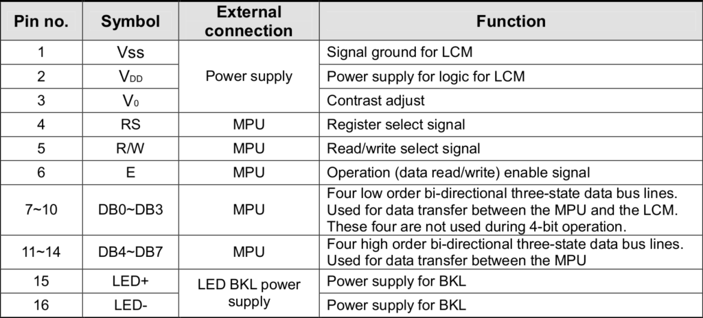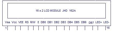1602 LCD Pins - note the 220R for Vcc at pin 15 for power and a 5k contrast resistor if no 10k pot available to pin 3 from Gnd: