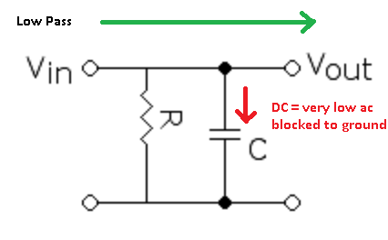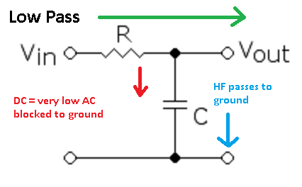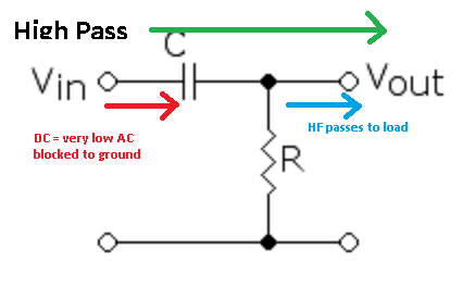In the High Pass, the DC or LF is blocked from the load leaving only the HF to pass.