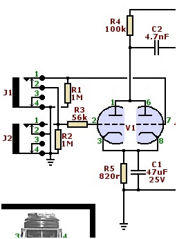 I used only 1 input here (J2), and just grounded pin 7 via R1 1M resistor. This pre amp and all other stages are inverters so that the output transformer secondary is back in phase with the input.