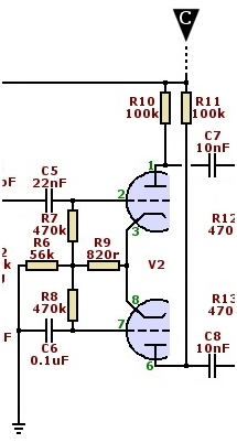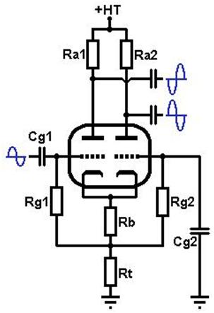 When designing, the same rules apply for the AC coupled version as for the DC coupled version. High mu, high current valves such as the ECC81 (12AT7) and 12AY7 are well suited as they operate well even at low anode voltages, providing lots of output swing for overdriving the power stage, while the ECC83 (12AX7) performs well when less clean headroom and a touch more preamp distortion is desirable. A larger tail resistor improves balance, although too large and it will limit maximum output signal swing and even lead to frequency doubling ('swirl'). Most guitar amps use less than 50k for the tail. To cathode bias, the tail resistor is split and the voltage at that point is tapped off and applied to the grids via grid-leak resistors, in the same way as for the- AC coupled cathode follower."